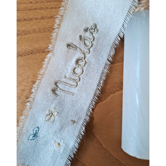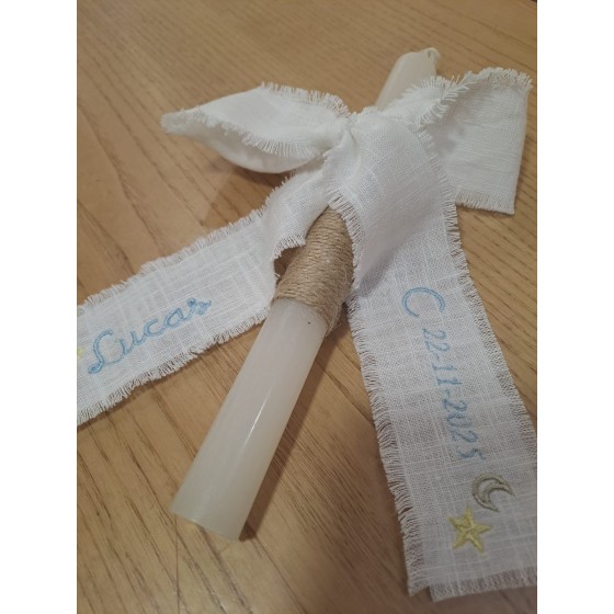 Vela de bautizo personalizada con nombre y fecha con tipografía manuscrita.