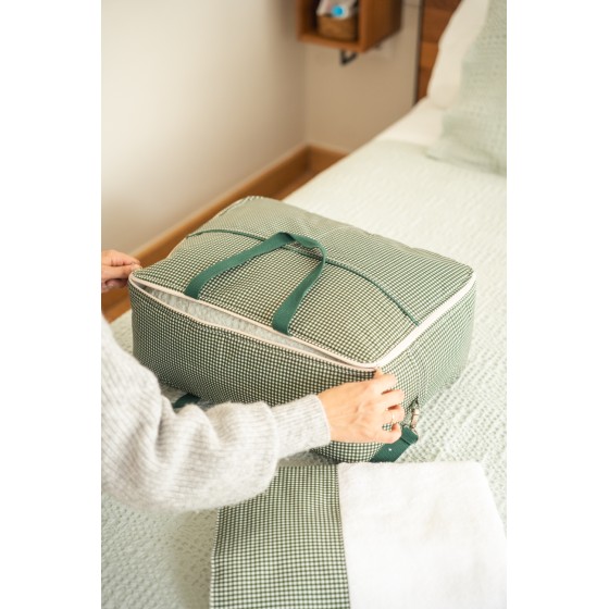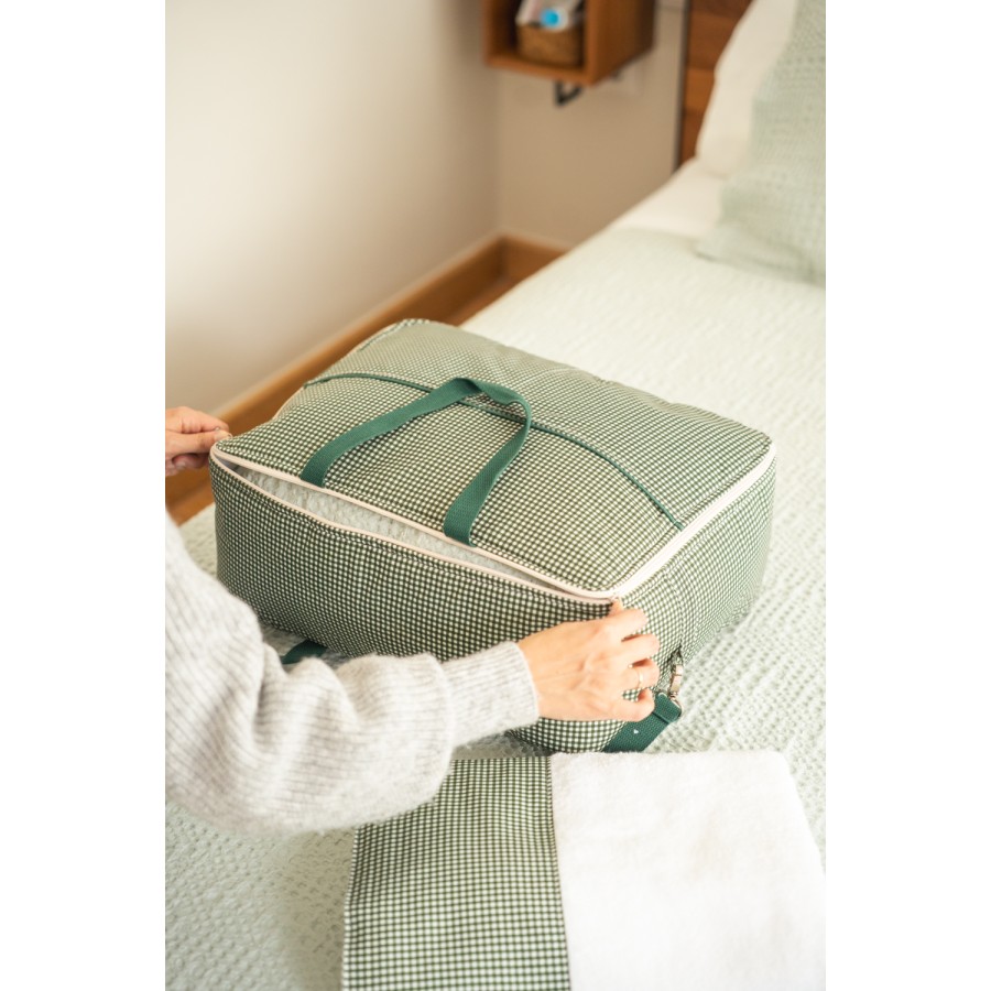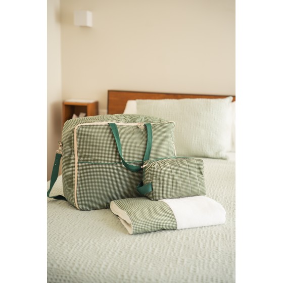 Maleta maternidad confeccionada con tejido resinado de cuadro vichy verde.