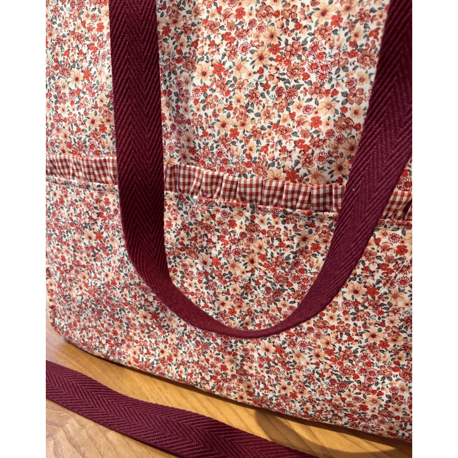Maleta maternidad confeccionada con tejido resinado de flor Matilda combinada con un volante vichy y asas combinadas.