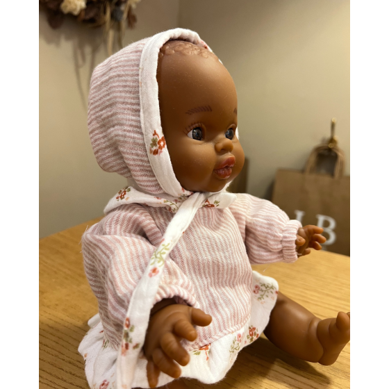 Muñeca mulata vestida con raya rosa y flor. Incluye camisa, ranita y capota combinadas.