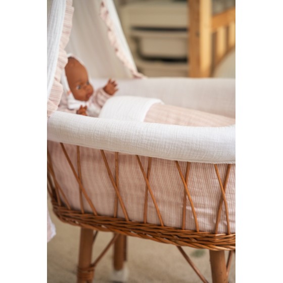 Moisés de juguete para muñecas, de mimbre con vestiduras. Dosel a juego confeccionado en bambula blanca con volante de raya.