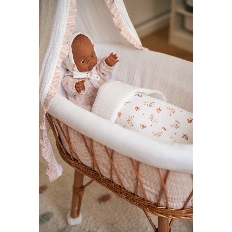 Moisés de juguete para muñecas. Incluye la estructura de mimbre y las vestiduras.