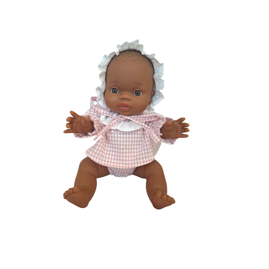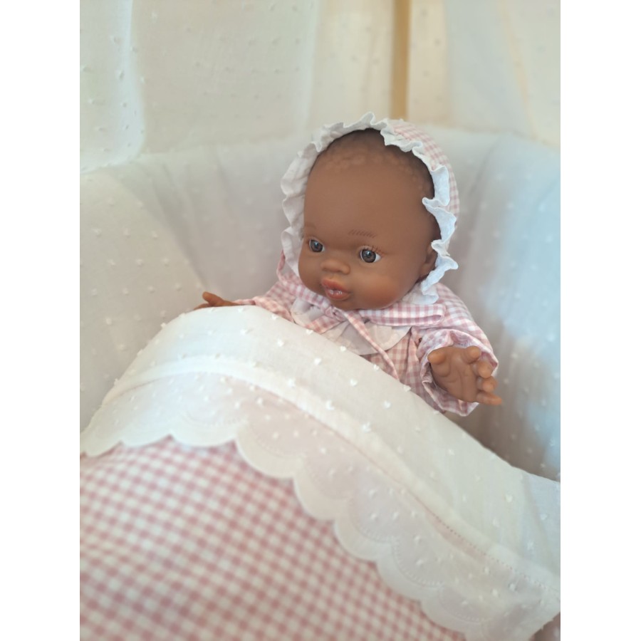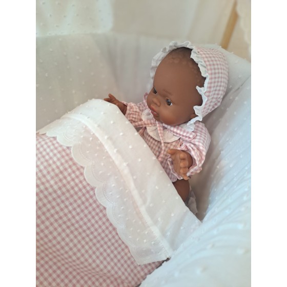 Muñeca mulata vestida con ropa en tejido de cuadro vichy rosa combinada con plumeti.