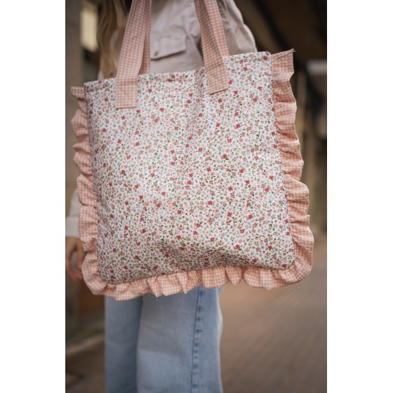 Tote Bag con tejido flor Sara y volante en vichy, tejido impermeable.