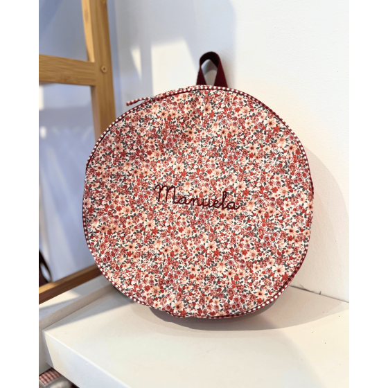 Funda de pandereta con asa de colgar en tejido resinado flor Matilda y bies vichy granate.