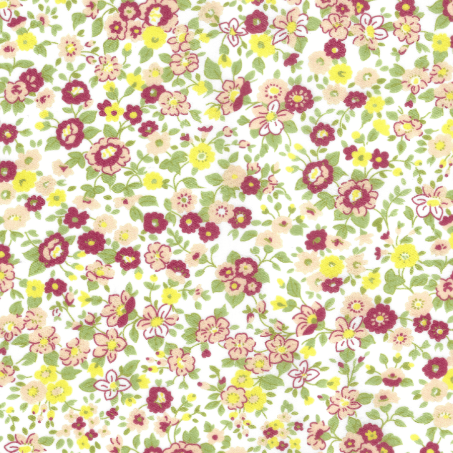 Tejido 100% algodón estampada en tonos amarillo, verdes y rosas.