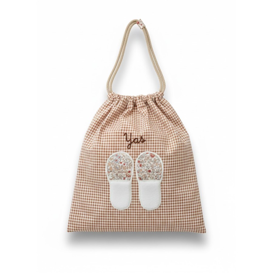 Bolsa para zapatillas en tejido de cuadro vichy teja con detalles en flor Candela.