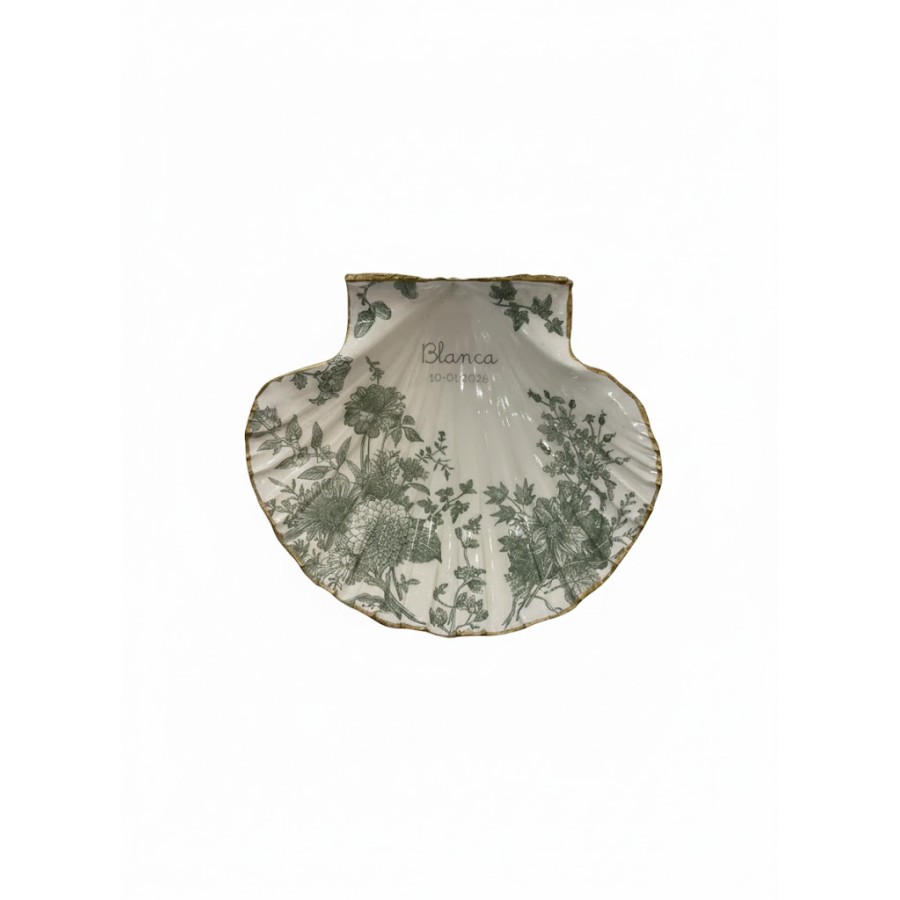 Concha bautismal hecha de manera artesanal con dibujo, nombre y fecha.